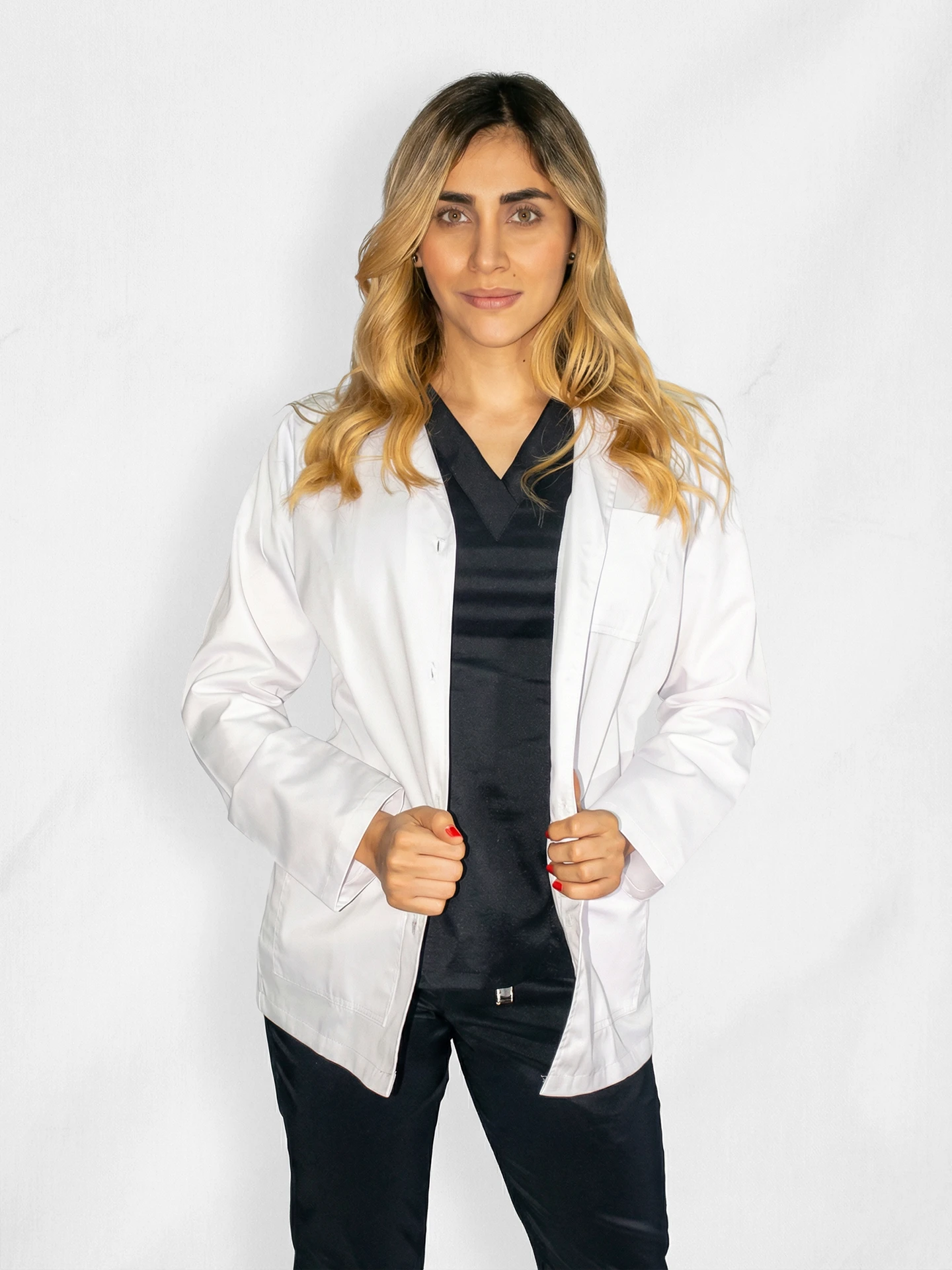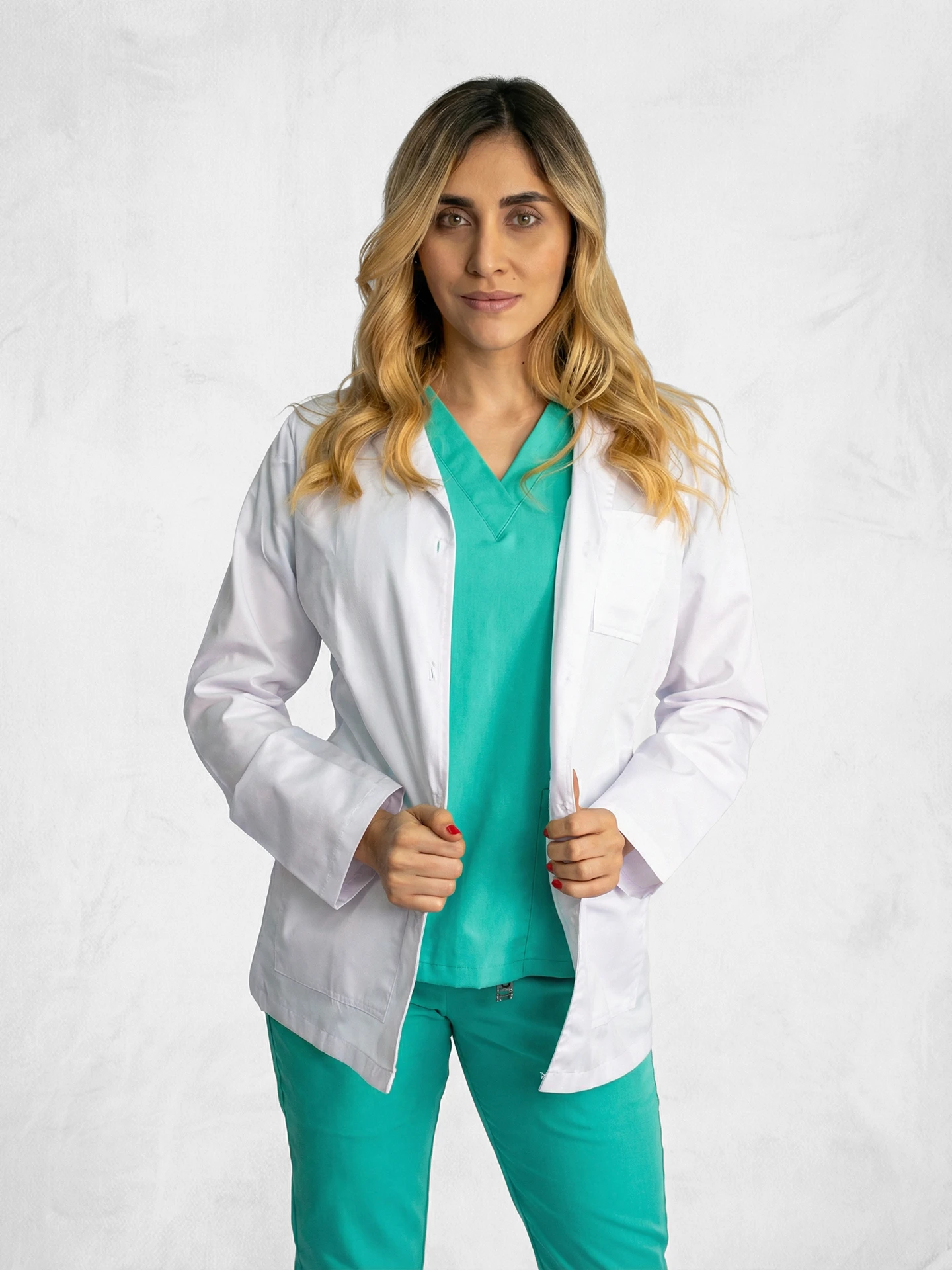 Fabricado con textiles de vanguardia seleccionados para inhibir partículas y ofrecer “protección específica” en entornos clínicos. La blusa cuenta con un favorecedor cuello en V (visible en la imagen), y el pantalón está diseñado con una cintura ergonómica y bolsillos funcionales para tus herramientas esenciales. Es la unión perfecta entre la moda actual y las exigencias técnicas de hospitales y clínicas.